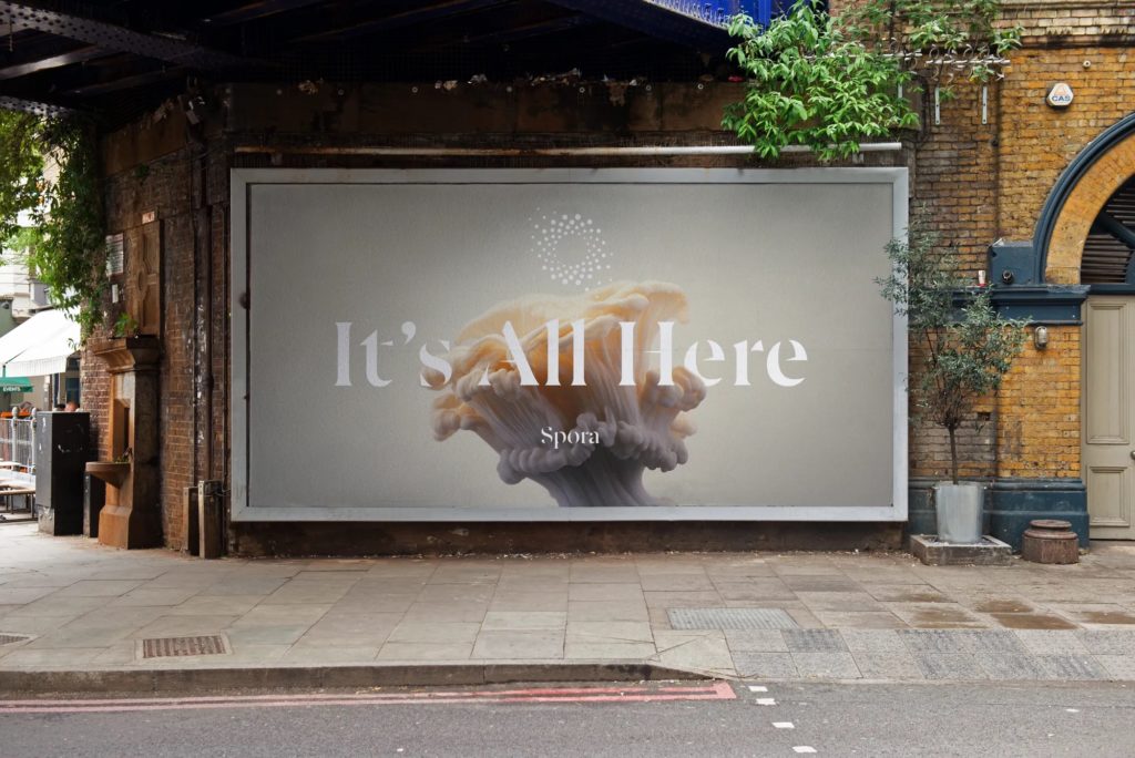 This icon is accompanied by a wordmark designed in a typeface that plays on the idea of appearance and disappearance, perfectly illustrating the interaction between what is visible and invisible in nature. The thin strokes are so fine that they break the letters into several parts while the result underlines the parallel between the invisibility of the natural processes of the mycelium underground and their crucial influence on the environment. The pointed endings of the serifs contribute to this impression of immateriality of the logotype as well as to the sophistication of Spora’s image.