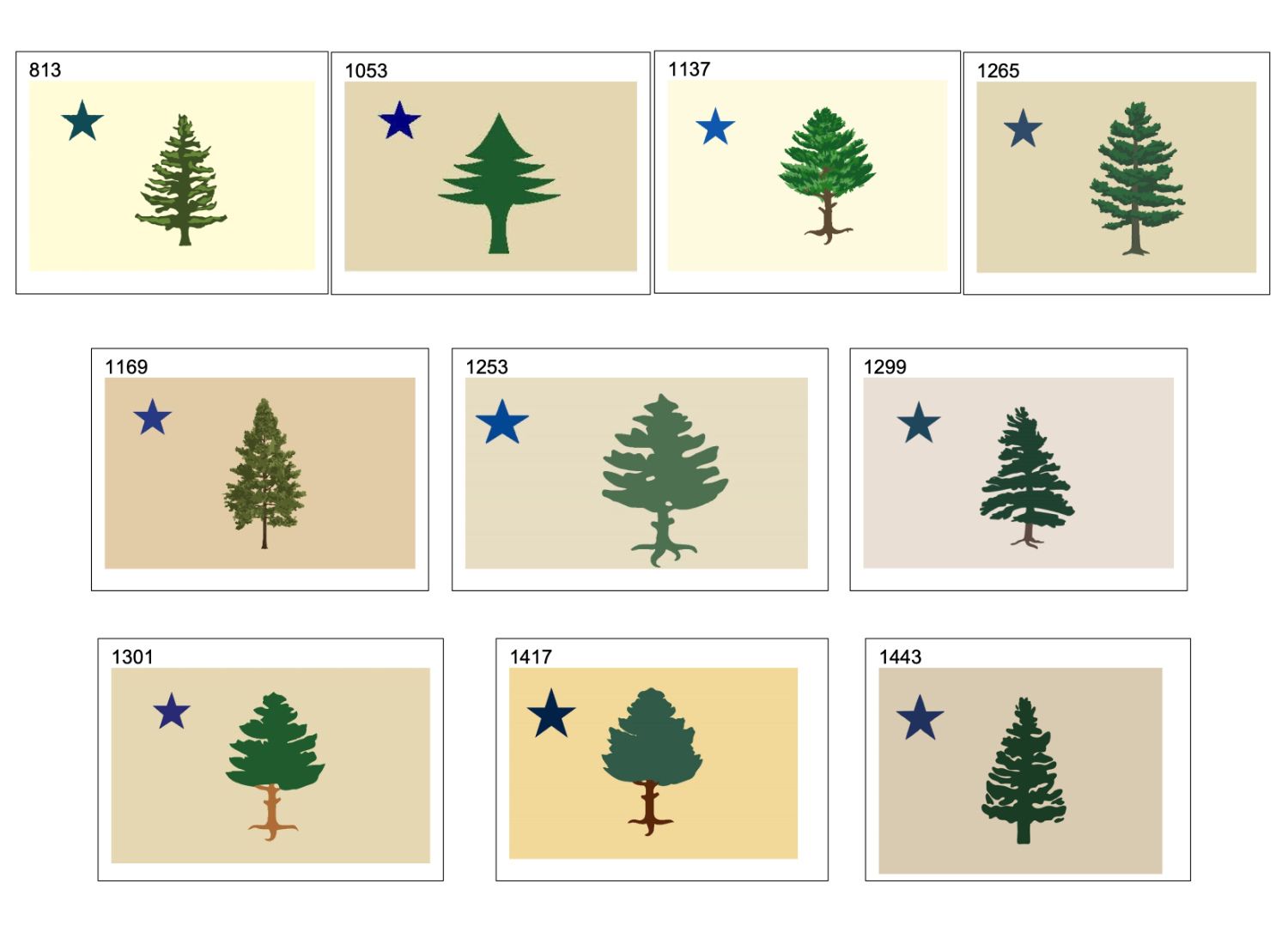 The Act to Restore the Former State of Maine Flag was initiated by Maine State Representative Sean Paulhus (D) and was adopted by a majority vote earlier this year. Since the general design of the future flag, including dimensions, spaces, and proportions, is specified in the act, all the submissions for the competition look similar, depicting a green pine tree and a blue or green star on a sand-colored background.