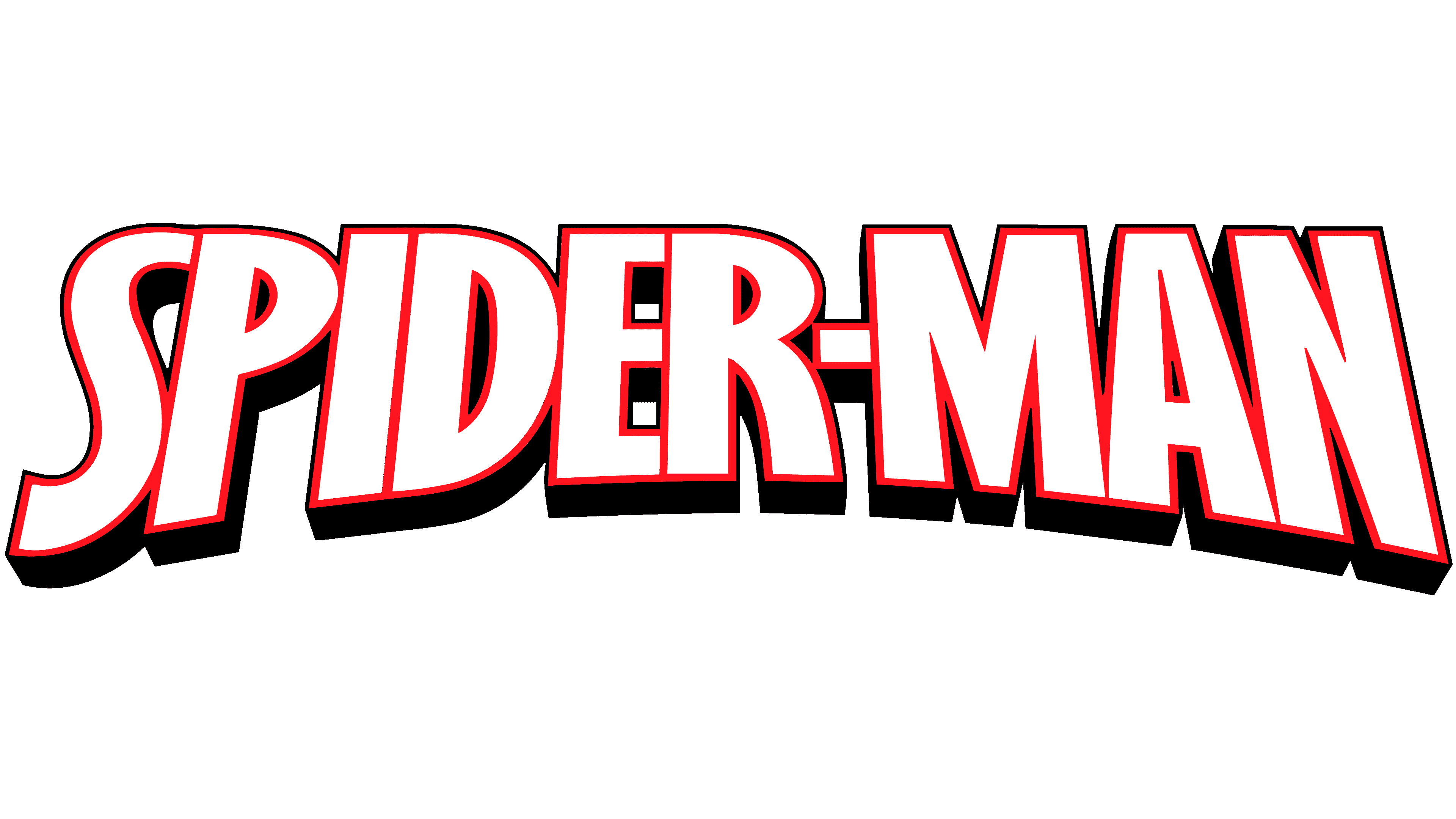 The redesign of 2016 has introduced a more geometric and stable style of the Spider-Man logotype; with the white letters in a thin red outline featuring a heavy black shadow, rounded corners and smooth square shapes of the characters. The angle of the insignia created a very energetic feeling, full of motion and power.