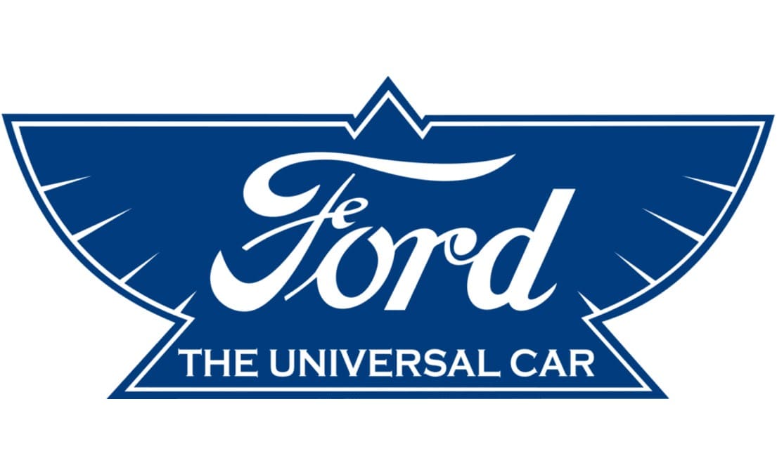 The version of 1912 is the most interesting one. It still features the same style of the nameplate, but now it is located on a blue badge, stylized like a bird. All the details are executed in white and there is a delicate yet strict tagline, “The Universal Car”. This design stayed with the company for five years and is the only one with such an unusual shape.