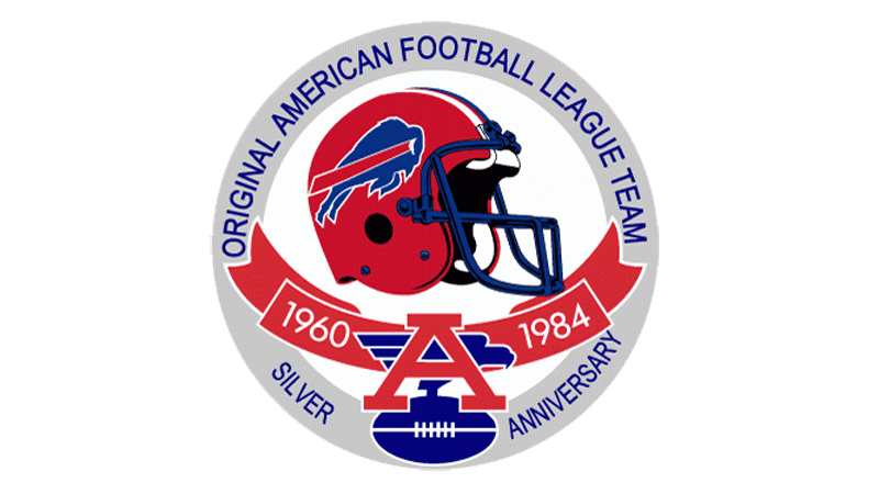The silver anniversary of the club in 1984 was marked by the creation of a medal-like emblem, with the red and blue Buffalo Bills helmet enclosed into a circular light gray frame with blue uppercase lettering around its perimeter, and decorated by the red ribbon, arched under the helm, with the dates “1960” and “1984”.