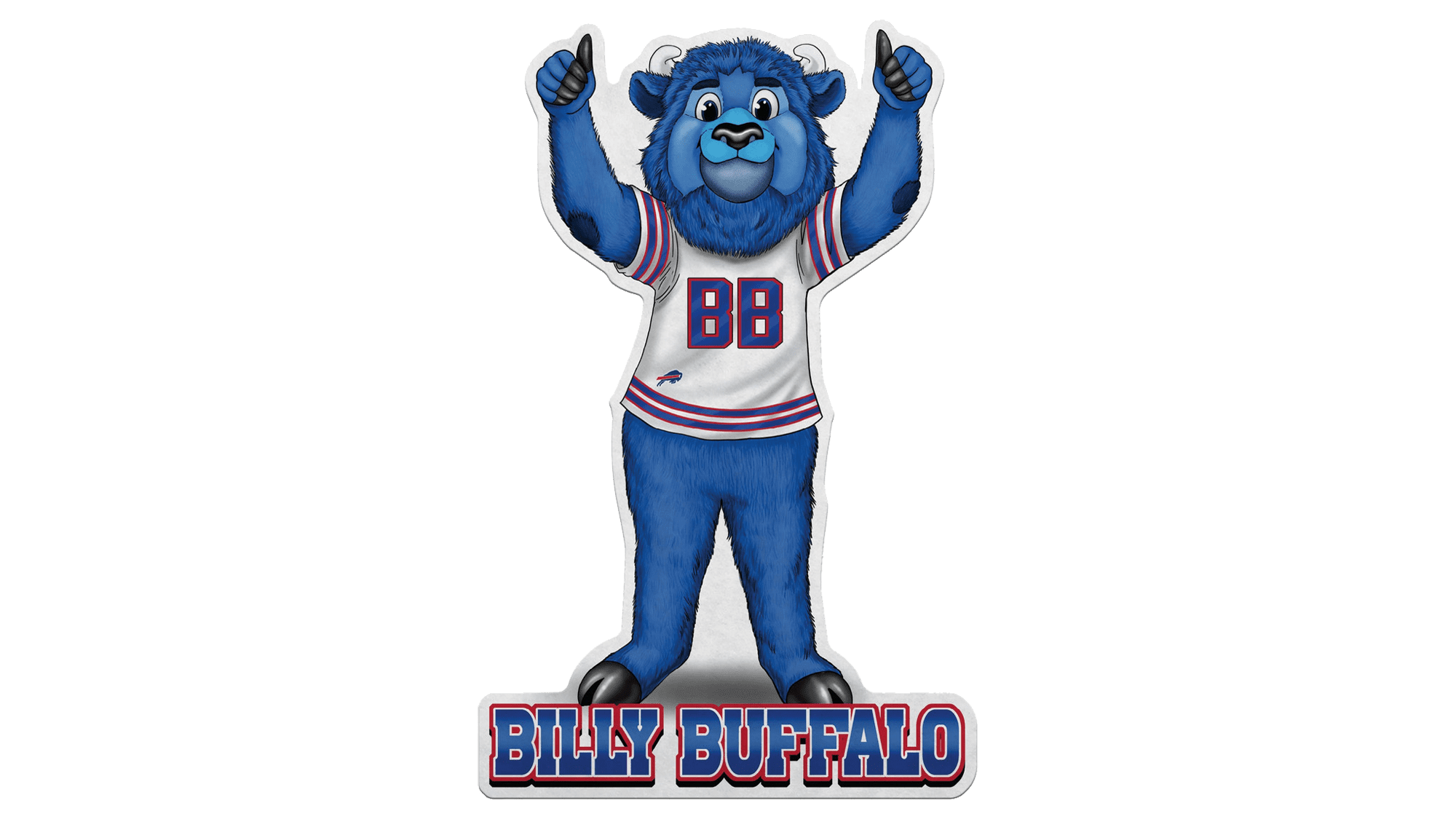 One of the cutest and brightest mascots of the NFL, Billy the Buffalo, was introduced to the public in 2000 and redesigned just once (as of 2024), in 2018. It is a huge light blue buffalo bull, which wears a white jersey with blue stripes in a red outline. Instead of the number, the chest of the jersey is decorated by a bold blue “BB” monogram, also in a red outline.