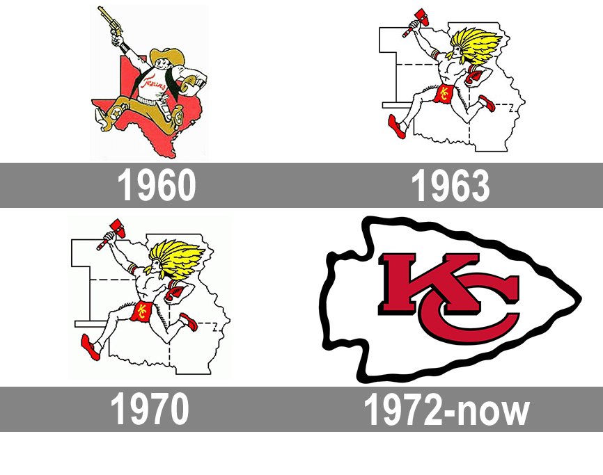 Today, the Chiefs logo are the interlocking cherry-red “KC” inside a white arrowhead-like figure. The arrowhead’s contour is black and chipped.