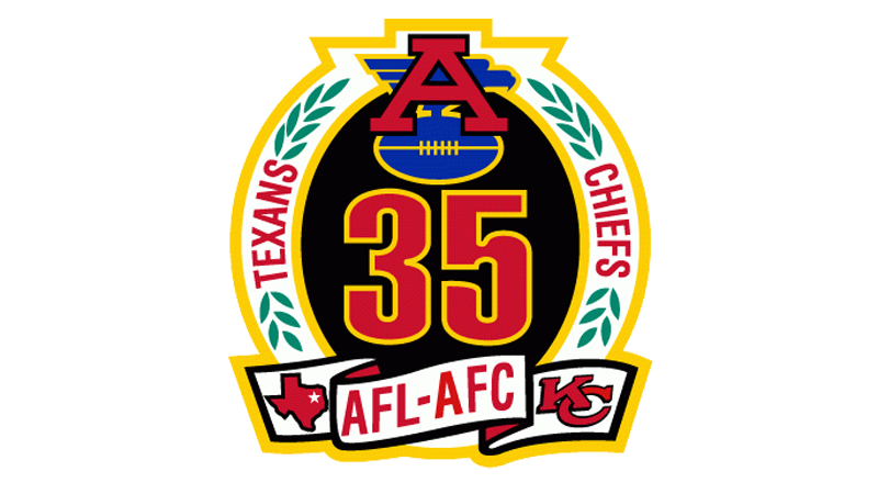 For the silver anniversary of the American Football League, the predecessor of the NFL, in 1984 a special badge was designed for each of the members, including Kansas City Chiefs. It was a white roundel with a gray frame and blue lettering around its perimeter. The central part of the badge was decorated with the image of the team’s helmet in red.