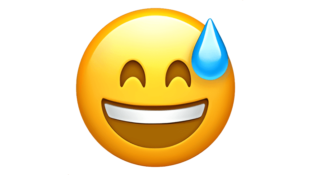 π - A face with a wide smile and a drop of sweat on its forehead, often featured in resources like Emojipedia and designed by their respective creators. This emoji transmits the meaning of laughing slyly or plotting something. It is a wide smiling face with squeezed eyes and a drop of sweat. The face shows two clenched eyes, an open mouth, upper teeth, tongue, and a drop of sweat. It represents comfort, tension, and embarrassment, and is typically used in awkward and tense situations.